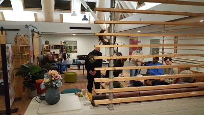 Het idee was om de hal van het paviljoen leuk aan te kleden. Al jaren lang was deze ruimte onderbenut door gebrek aan activiteiten en uitstraling. Dankzij wijziging van aanpak en samenwerking van de verschillende groepen is hier verandering in gekomen. Helaas, door de Corona tijd heeft dit zich nog niet verder kunnen ontwikkelen, maar er was, zeker nu meer behoefte om samen te komen. Door de ruimte beter in te delen met room-dividers, accessoires en kleur/gezelligheid wilde men een extra leuke plek creëren waar verschillende groepen en cliënten weer samen kunnen komen.